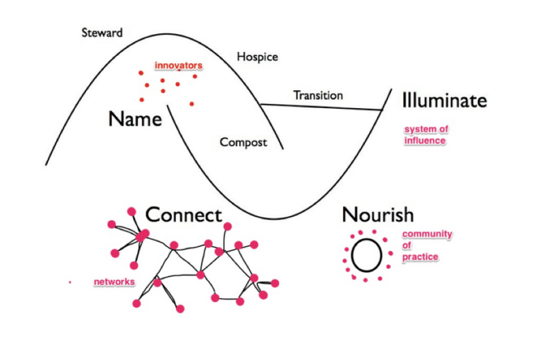 Once connection happens on a regular basis and is centered around progressive action, it becomes a community of practice. This includes failing forward together and upwards as the new system continues to emerge and build. It’s also a place to nourish the system so it can keep growing. New systems need: time, space, money, expertise and skill building.