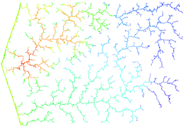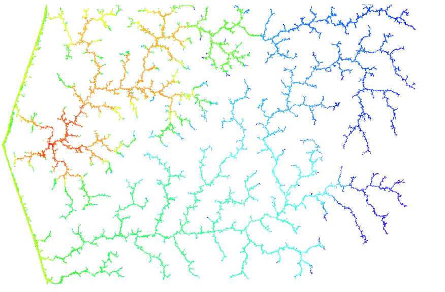 | The winding cracks in this image were created naturally by compressed air injected into wet sand, with color denoting when they formed—red is earliest, violet is latest. Image Credit: Campbell, Ozturk, & Sandnes (2017). Physical Review Applied. |