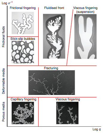 | A variety of the so-called “invasion patterns” formed by the gas, depending on how fast it gets pumped in to the cell. Image Credit: Campbell, Ozturk, & Sandnes (2017). Physical Review Applied. |