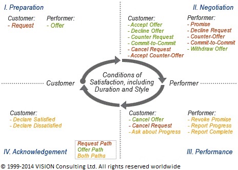 5. When the requester, always acknowledge and assess the delivery. Honesty and truth demand an assessment as to whether the delivery met the original expectations. Answering the question – were you satisfied? – completes the cycle and assures closure. This underutilized practice is the minimum quid pro quo to the effort of the performer and serves to represent the customer’s accountability to honor the agreement. Moreover, these are the “golden moments” when feedback can enhance both future performance and trust. End-of-year performance reviews have lost much of their value, and this practice heightens the value of more continuous performance feedback.