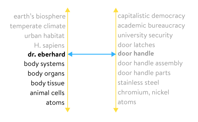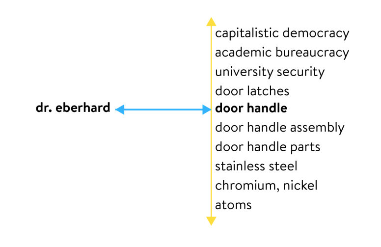All these systems talk to each other. While Dr. Eberhard is dealing with his door handle, environmental agencies are trying to figure out how to revert the harmful effects of out-of-control manufacturing systems on Earth’s biosphere. And atoms of a door handle are peacefully swerving in the void along with the atoms of Dr. Eberhard’s hand.