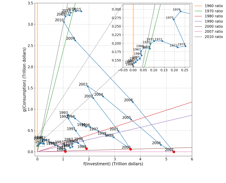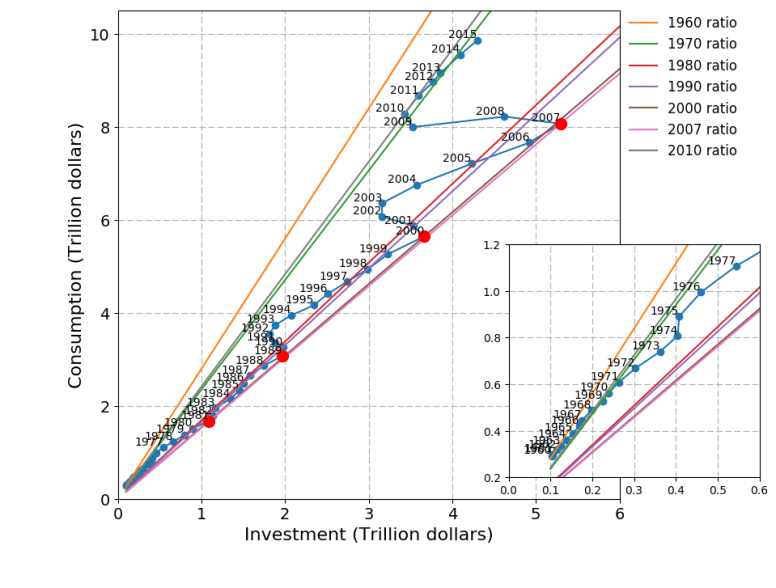 FIG 10: Plot of consumption versus investment between 1960 and 2015. The straight lines represent the dynamics of the economy if the ratio of consumption to investment were fixed. Recessions occurred in years marked by red dots.