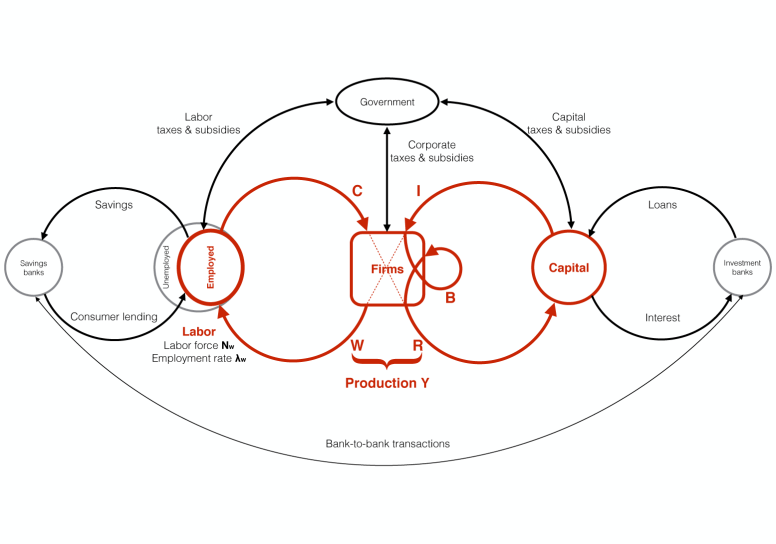 FIG 1: Schematic model of monetary flow representing the wages and consumption loop and capital and return loop (red). Transfers from or to banks (savings and loans) and government (taxes, transfers, subsidies and other economic activities) are also indicated (black).