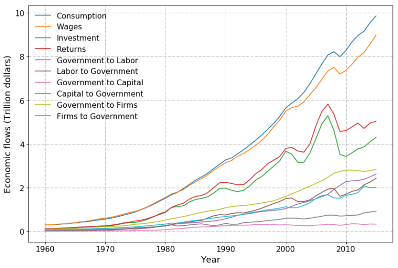 FIG 3: Economic flows in the US from 1960 to 2015 according to categories of Fig. 1.