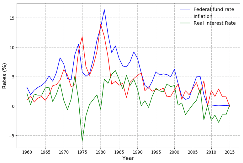 FIG 12: Interest rate (blue), inflation rate (red), and real interest rate (green) showing the two regimes of behavior prior to and after 1980 consistent with investment limited and consumption limited regimes.This suggests that the current zero interest rate is not due to the financial crisis but rather due to the limiting behavior associated with the consumption limited regime that started in 1980.