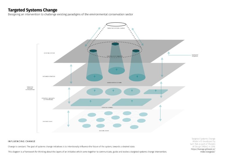 I developed this model as part of my Masters of Design, in order to communicate my design process, and to give shape to the sometimes slippery concept of systems change work which may be about culture, relationships and products/services.