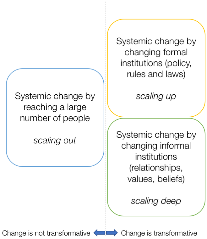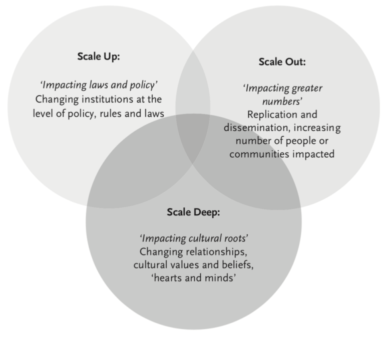 ‘Scaling out’ refers to the most common way of attempting to getting to scale with an innovation: reaching greater numbers by replication and dissemination. ‘Scaling up’ refers to the attempt to change institutions at the level of policy, rules and laws. Finally, ‘scaling deep’ refers to changing relationships, cultural values and beliefs.