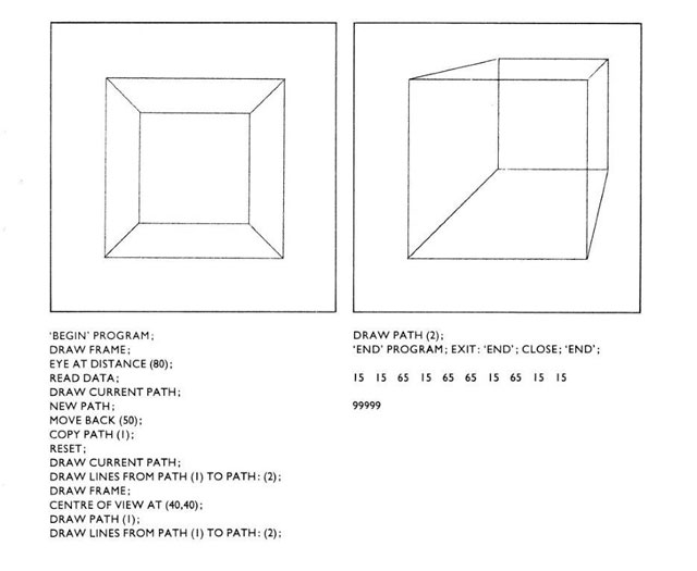 Example of NEW PICTURES computer graphics language for artists at Lanchester Polytechnic, Coventry School of Art by R Johnson, 1979.