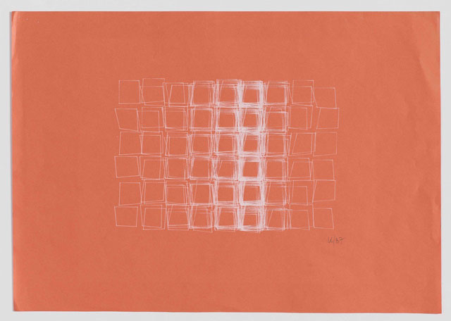 Vera Molnár. Structure de Quadrilatères (Square Structures), 1987. Computer drawing with white ink on salmon-coloured paper, 11 3/4 x 16 1/2 in. Courtesy Senior & Shopmaker Gallery, New York.