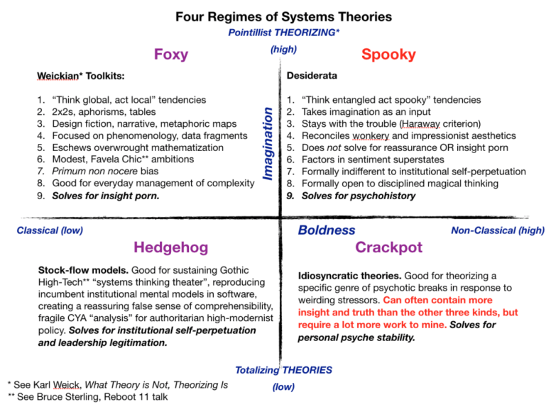 The 2×2 of systems theories above is a generalization of the fox/hedgehog dichotomy of systems theories I developed in my 2013 talk on foxy systems theory (slides here, the video is unfortunately not public). I added a classical-to-non-classical axis, and labeled the hedgehog-to-fox range endpoints theory andtheorizing, following Weick.