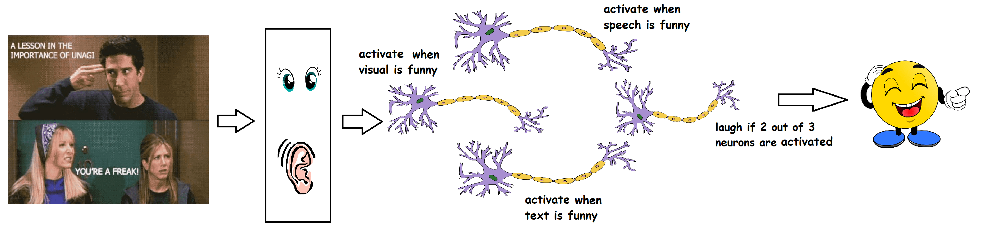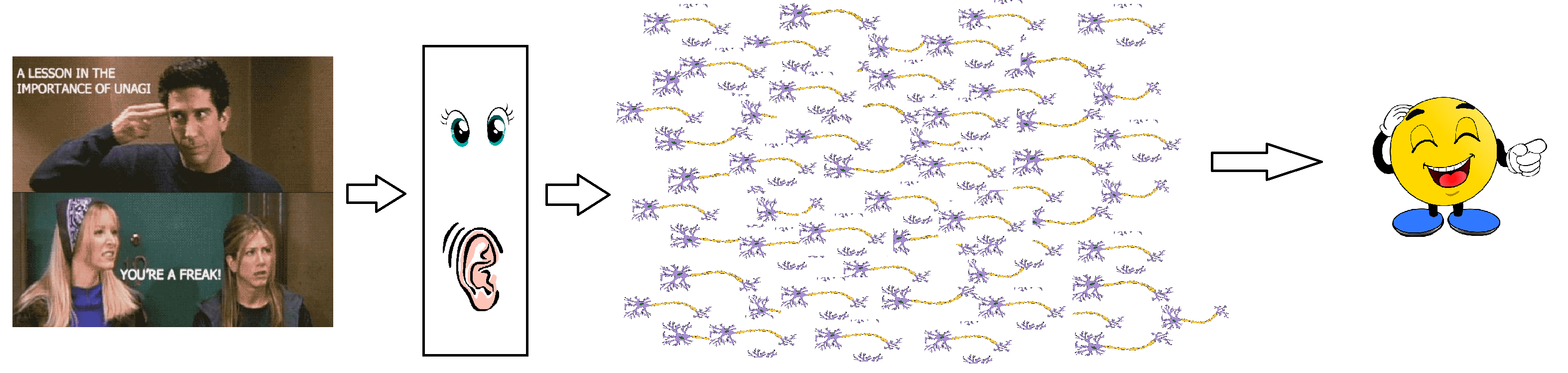 Now the sense organs pass the information to the first/lowest layer of neurons to process it. And the output of the processes is passed on to the next layers in a hierarchical manner, some of the neurons will fire and some won’t and this process goes on until it results in a final response — in this case, laughter.