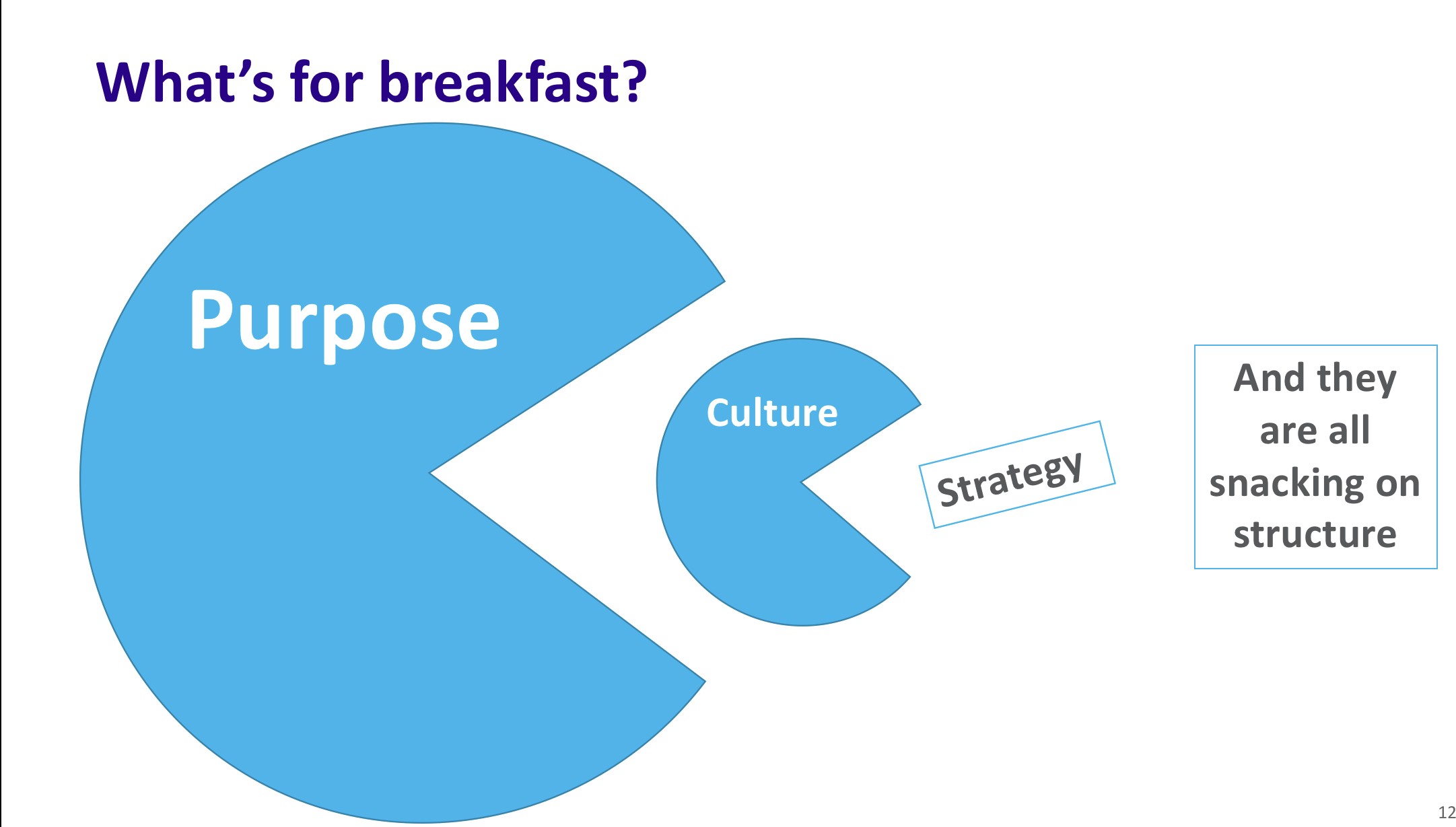 I wrote a while ago about my belief that all change should actually be thought about as system change and this belief brings a challenge to the culture beats strategy trope. While culture may be preeminent as a change mechanism if you have an industrial model of an organisation, in a system or network based view of organisational forms — like the garden metaphor — then there are more powerful forces at play. Because while culture may eat strategy for breakfast it doesn’t and in fact can’t eat purpose. In a more networked organisation culture can be overwhelmed by purpose while the more rationalist concepts of strategy and structure are left behind.