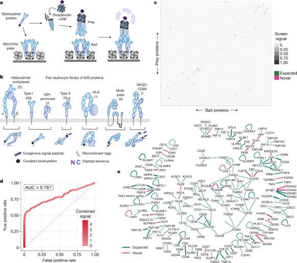 The human immune system is composed of a distributed network of cells circulating throughout the body, which must dynamically form physical associations and communicate using interactions between their cell-surface proteomes1. Despite their therapeutic potential2, our map of these surface interactions remains incomplete3,4. Here, using a high-throughput surface receptor screening method, we systematically mapped the direct protein interactions across a recombinant library that encompasses most of the surface proteins that are detectable on human leukocytes. We independently validated and determined the biophysical parameters of each novel interaction, resulting in a high-confidence and quantitative view of the receptor wiring that connects human immune cells. By integrating our interactome with expression data, we identified trends in the dynamics of immune interactions and constructed a reductionist mathematical model that…